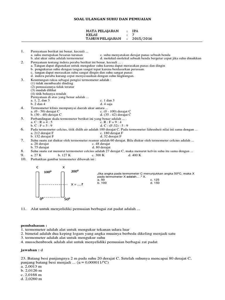 Namun jangan khawatir karena video belajar. Contoh soal suhu dan pemuaian ini disusun dalam bentuk pilihan berganda dilengkapi dengan pembahasan dan dirancang sedemikian berdasarkan beberapa subtopik yang paling sering keluar dalam kajian suhu dan pemuaian untuk tingkat menengah pertama. 13102020 soal dan pembahasan matematika kelas 7 bilangan bulat. Mudahnya, semakin tinggi suhu suatu benda, semakin panas benda tersebut. Contoh soal perbandingan suhu pada termometer contoh.